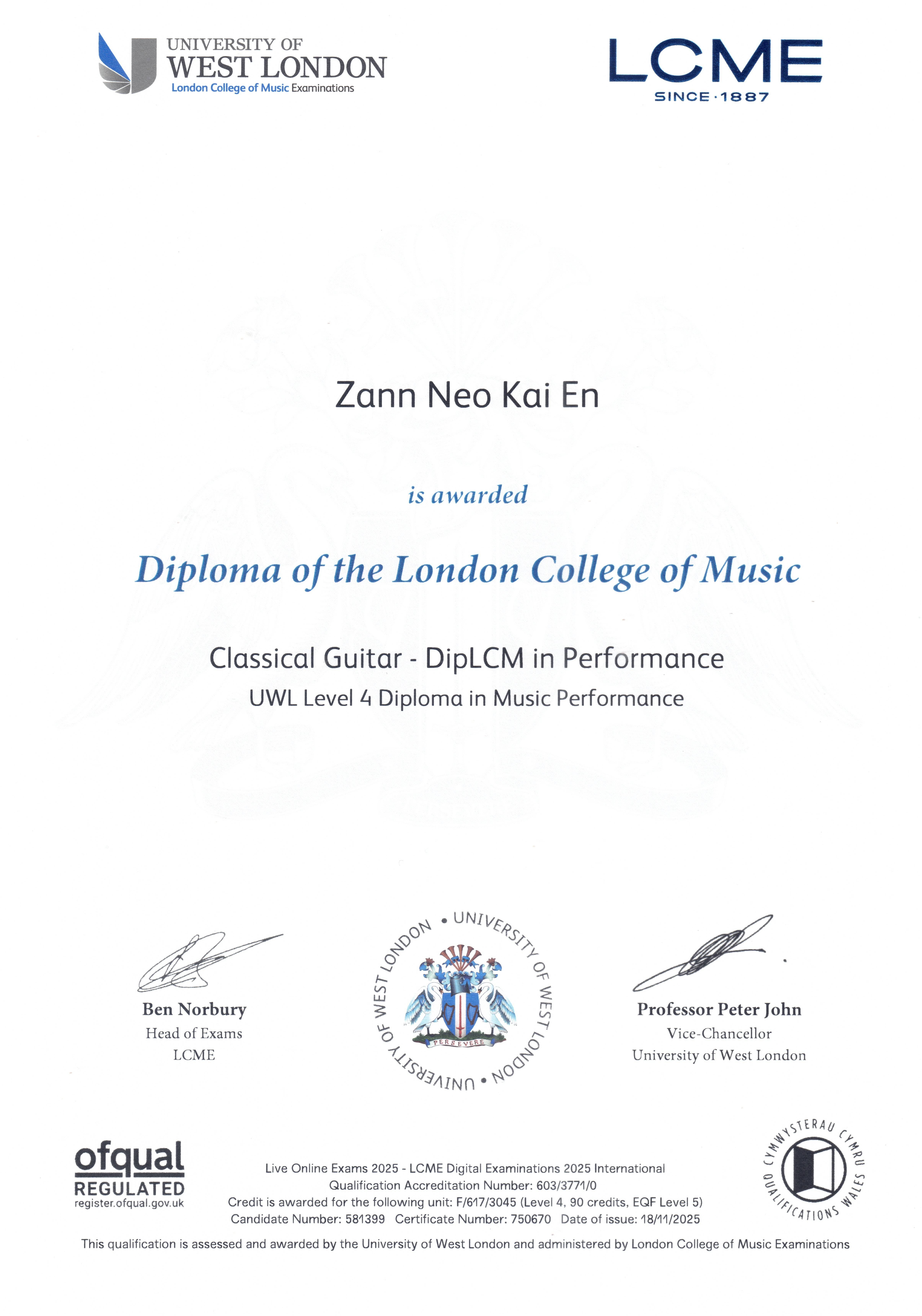 Diploma in Classical Guitar Performance, DipLCM (2025)